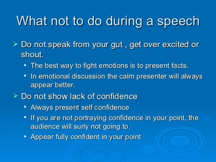 Theres an unfortunate temptation in a short speech to try to cram everything you have to say into a short time. There are many things you should never do during an argument or confrontation with anyone unless youre just arguing for the fun of it or want to get into a fist fight or have someone hate you.